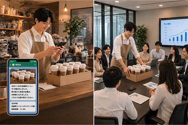 ターゲット: 近隣企業から会議用コーヒーの注文・配達依頼を受ける喫茶店 。 お悩み(ニーズ): 急な会議の時間変更や人数の増減を正確に把握したい。決済は後日まとめて処理したい 。 LINE活用術: 複雑なやり取りをLINEのトーク・注文機能へ集約 。決済は従来通りの事後処理(ツケ払い等)を継続 。 メリット: 電話対応の手間を削減し、忙しい業務の合間でも正確な受注管理が可能になります 。