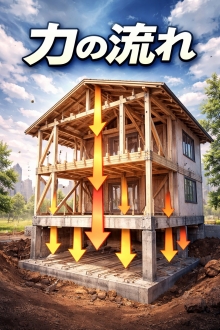 ■力の流れを考える(なぜ大事?) 建物の安全性を考えるときに一番大切なのは、建物に加わった荷重や外力が、最終的に地盤(地面)までどう伝わるかを理解することです。 建物は、力を受けて終わりではなく、受けた力を部材から部材へ渡しながら、地面へ逃がすことで成り立っています。 ■鉛直荷重(重さ)の流れ:上から下へ、だんだん大きくなる 例えば、2階建て住宅での鉛直荷重(屋根・床・人・家具などの重さ)がどこを通って地盤へ行くかを考えてみます。 ここで押さえるポイントは2つです。 ・力は基本的に、下へ流れる ・下へ行くほど、力は足し算されて大きくなる(累積する) たとえば、2階の床の重さは2階の梁や壁だけでなく、1階の柱や壁にも伝わり、最後は基礎・地盤へ行きます。 そのため、1階の柱や基礎の方が、2階より大きな力を受けやすいわけです。 さらに、もし梁の直下に柱がないと、梁が中空で支えられない状態になり、梁には大きな曲げ(たわみやすさ)が発生します。 つまり、力の通り道を考えると、構造の弱点が見えてきます。