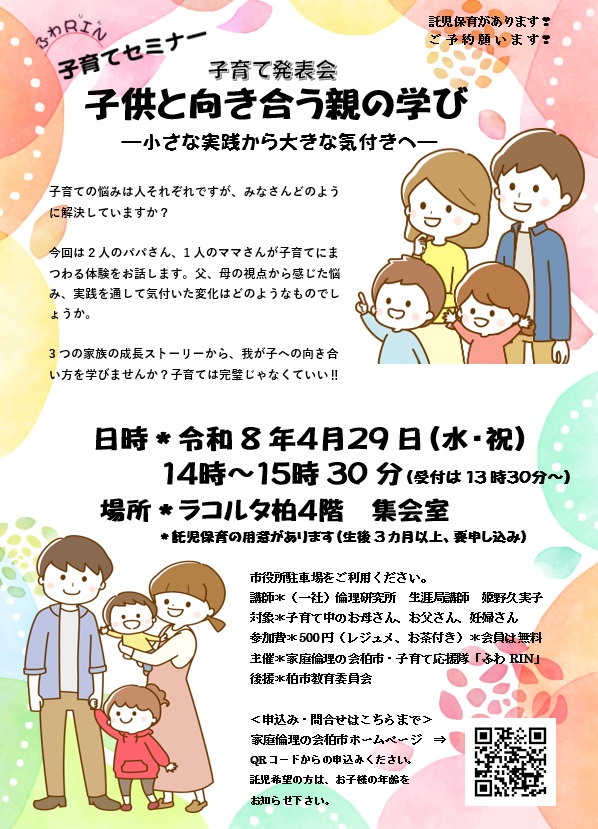 場所*ラコルタ柏 4階 集会室(教育福祉会館)市役所Pあり (柏市柏5丁目8-12) 講師*(一社)倫理研究所 生涯局講師 姫野久実子 対象*子育て中のお母さん、お父さん、妊婦さん 参加費*500円(レジュメ、お茶が付きます)*会員は無料 主催*家庭倫理の会柏市・子育て応援隊「ふわRIN」 後援*柏市教育委員会