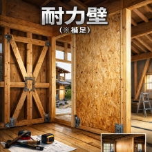耐力壁とは、地震や風などで建物に横から力がかかったときに、その力に抵抗して建物を支える壁のことです。 木造住宅では、この耐力壁の強さを「壁倍率」という数字で表します。 この壁倍率は、建築基準法施行令46条の表1や1981年建設省告示1100号で定められています。