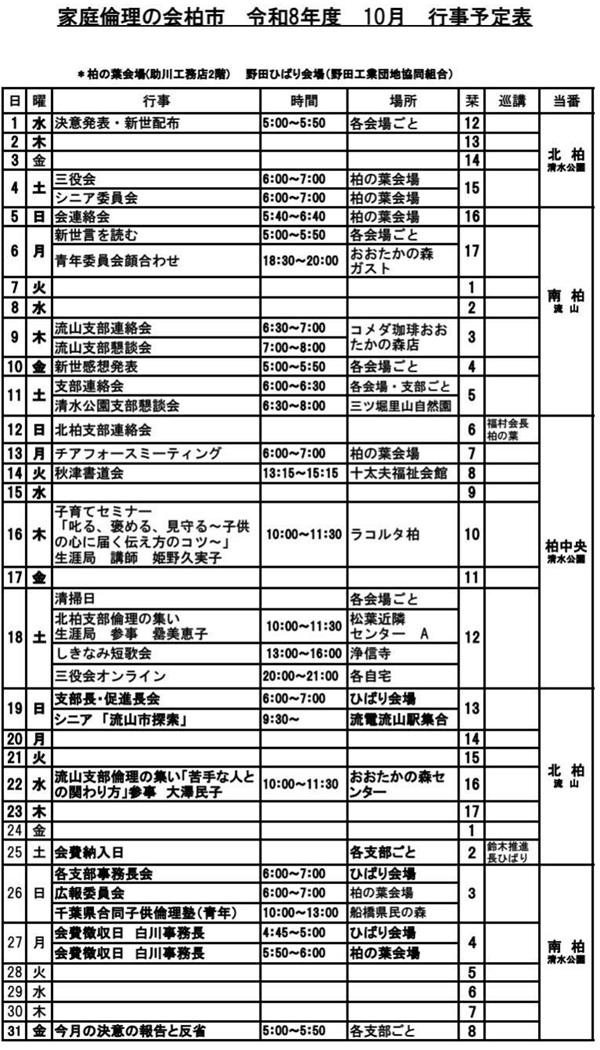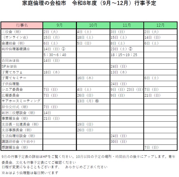9月20日、令和8年度(9月~12月)行事予定を10月度予定の下に追加しました。 9月25日、10月度予定をアップしました。