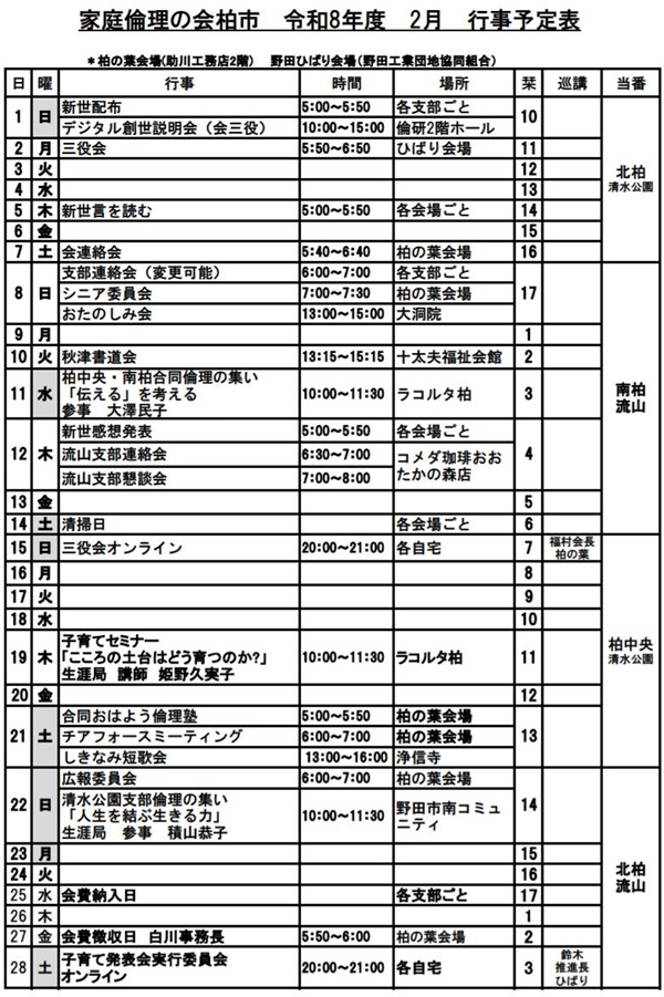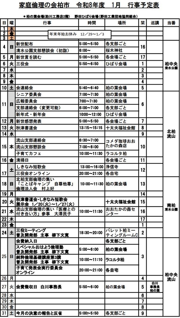 令和8年度(1月~4月)行事予定が、2月度予定の下にあります。 1月21日、2月度予定をアップしました。