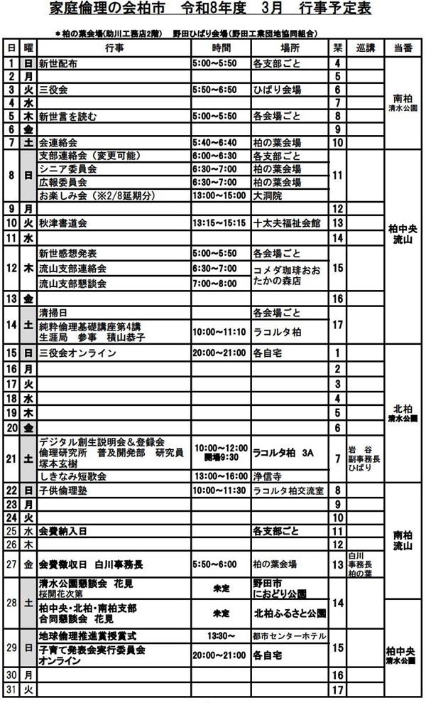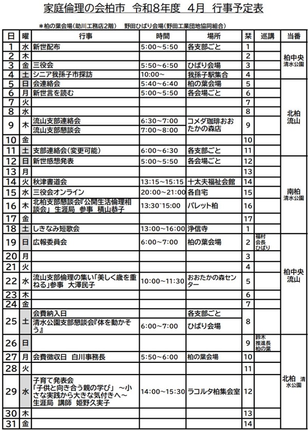 令和8年度(1月~4月)行事予定が、4月度予定の下にあります。 3月23日、4月度予定をアップしました。