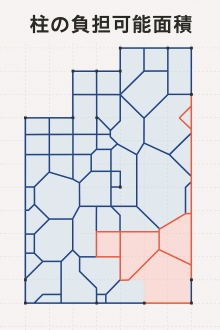 実際にそれぞれの柱が負担する床面積については、幾何学的に手計算することも可能ですが、構造計算プログラムなどから確認することになります。 次回は、小径の確認が不要な柱や柱の欠き込み、隅柱などについてお話します。