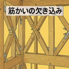 筋かいの断面を欠き込むと、引張力や圧縮力を受けたときに、欠き込み部分が壊れやすくなります。 したがって、基本的には筋かいに欠き込みをしてはいけません (施行令第45条第4項) 筋かいが間柱などと交差する場合には、間柱を欠きとるなどして筋かいを通すようにします。 また、筋かいをたすき掛けする場合はできるだけ断面を欠き込まないように工夫することが望ましいのですが、正角(90*90)の筋かいを設置する場合など、やむを得ない場合には、補強する方法はあります。