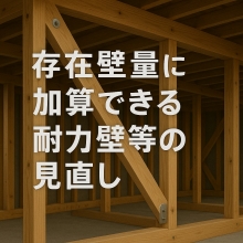 ① 準耐力壁等を存在壁量に含められるように変更 今までは、耐力壁として数えていなかった腰壁(窓の下部分の壁など)や袖壁(短い壁)なども、耐震性に役立つことが分かってきたため、一定条件で「存在壁量」に加えることができるようになりました。 対象となるのは、 ・面材や木ずりを柱や間柱だけに釘打ちした壁 ・垂れ壁(天井から下がっている壁) ・腰壁(窓の下部分の壁など) これらの準耐力壁等が「必要壁量」の半分を超える場合は、柱に脆い破壊が起こらないかを確認する必要があります。 また、建物全体のバランスを確認する「四分割法」や柱頭・柱脚の接合確認は、準耐力壁の割合が半分を超えた場合には、それらも含めて計算します。 特に壁倍率が1.5倍を超える準耐力壁等 では、その倍率を使って柱接合部を検証します。 ② 高い耐力を持つ壁の壁倍率上限を引き上げ これまで壁倍率の上限は5倍でしたが、より耐力の高い壁を評価できるように最大7倍に引き上げられました。 ただし、壁が強すぎると周囲の構造や基礎に大きな力がかかるため、その影響を十分に考慮する必要があります。