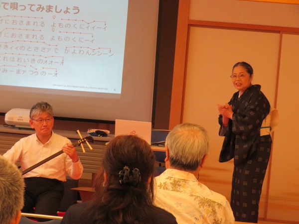 長唄の発声は腹式呼吸を用いるため肺機能の強化、三味線は左右の手を別々に使うことから、脳を活性化し認知症予防に寄与すると言われ、楽しみながら学ぶ実践型の健康促進を目的にセミナー開催いたしました。