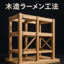 木造ラーメン工法とは、柱と梁をしっかりつないで「骨組み(フレーム)」をつくる建て方のことです。 鉄筋コンクリート造(RC造)や鉄骨造(S造)ではよく使われていますが、中大規模木造ではまだ新しい挑戦の分野です。 多層の木造オフィスビルを木造ラーメンで建てることは、木造建築業界の長年の夢といわれています。 これまでの木造ラーメン工法は、主に住宅向けに研究・開発されてきました。 住宅規模を前提としたマニュアルも作られてきましたが、今後はオフィスなど中大規模建築物に対応した木造ラーメンの技術開発が進むと考えられています。