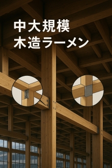 中大規模の木造建築では、とても大きな力(耐力)に耐える必要があります。 そのため、主に住宅用として開発されてきた木造ラーメン工法では、強さが足りないことがよくあります。