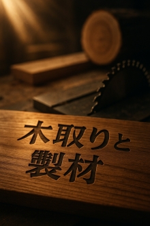 間伐 → 枝払い・集積 → 搬出(山から林道へ) → 積み込み → 土場(丸太置き場)へ → 選木・評価 → 製材・乾燥 → 製品