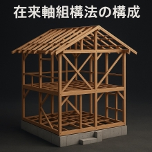 ① 基礎(きそ) 建物と地盤をつなぐ、鉄筋コンクリート造の土台部分。 役割: 建物の重さを支え、地盤に伝える。 地盤が不均一に沈む「不同沈下」を防ぎ、地震などの水平力も地盤に逃がす。 ポイント: 「閉じた形(連続した基礎)」にすると強くなる。途中で切れた基礎はひび割れの原因になりやすい。 ② 軸組(じくぐみ) 柱: 鉛直方向に立つ部材。 横架材: 水平方向に置かれる部材(土台や梁)。 柱と梁を組み合わせたものが「軸組(骨組み)」 建物の骨格をつくる基本的な構造。 注意点: 軸組だけでは、地震や風の横揺れ(水平力)には弱い。 ③ 耐力壁(たいりょくへき) 地震や台風などの「横からの力」に抵抗するための壁。 代表例は、柱の間に斜めに入れる「筋かい」 役割: 軸組では耐えきれない水平力を、壁の長さによって支える。 弱点: 壁の厚み方向に押されると倒れやすい。 ④ 床組(ゆかぐみ)・小屋組(こやぐみ) 床組: 梁の上に細い横材(根太)を並べ、その上に床板を張ってできる。 人や家具を支えると同時に、水平力を耐力壁へ伝える役割を持つ。 小屋組: 屋根を支える骨組み。梁の上に束を立て、その上に母屋(水平材)、さらに垂木や野地板を載せて屋根を構成する。 共通点: どちらも「水平構面」と呼ばれ、建物全体に加わる力を耐力壁に伝える重要な役割を持つ。 ⑤ 接合部(せつごうぶ) 仕口: 直交する部材同士の接合部。 継手: 同じ方向の部材同士の接合部。 木造では接合部の性能が建物の強さを大きく左右する。 特徴: 木造の接合部は「ピン接合」が多く、回転しやすい。そこで「方杖(ほうづえ)」や「火打ち材」を入れて、回転を防ぎ、より強固にする。 <まとめ> 在来軸組構法は、 基礎が建物を支え、 軸組が骨格をつくり、 耐力壁が横からの力を防ぎ、 床組・小屋組が全体をつなぎ、 接合部がそれぞれの部材を強く結びつける という仕組みで成り立っています。 人間の体でいう「骨格と関節」が建物にもあると考えると分かりやすいです。