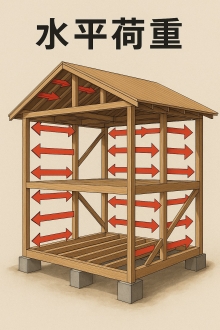 ■小屋(屋根まわり)の力の流れ 屋根に風や地震の力がかかると、力は次のように伝わります。 野地板(屋根の板) → 垂木 → 母屋・棟木・桁 → 小屋筋かい → 2階の耐力壁 つまり、屋根で受けた力は、まず小屋の骨組みを通って、最終的に2階の耐力壁に伝わります。 また、小屋筋かい(斜め材)がないと力が流れにくくなるため、しっかり配置することが大切です。 ■2階床・1階床の力の流れ 2階の床に力がかかると、それを支えるのは1階の耐力壁です。 床板 → 根太 → 床梁 → 1階の耐力壁 → 土台 → 基礎 → 地盤 また、2階の耐力壁に加わった力も1階に伝わります。 このとき、2階と1階の耐力壁の位置がそろっていないと、力はいったん床に流れてから下の壁に移ります。 したがって、2階の床は特に強く固めておく必要があります。 1階の床にかかる力も同じように流れていきますが、高床式の場合は床を支える束が倒れないように補強が必要です。 ■耐力壁が効く理由 人が押されたとき、足を前後に広げると踏ん張れますよね。 壁も同じで、細い柱だけでは横からの力に弱いけれど、長さのある壁なら大きな力に耐えられるのです。 つまり、耐力壁は建物を横から押さえつける「踏ん張り足」のような役割を果たしています。 <まとめ> 横からの力は「床 → 耐力壁 → 基礎 → 地盤」へ流れる。 力をきちんと伝えるには、床を固くつなげ、耐力壁を適切に配置することが重要。