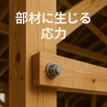 ③ 曲げ(たわむ力) 説明:部材がたわむことで、片側は押され(圧縮)、反対側は引っ張られる(引張)。 例:梁が床を支えるときや、柱が風を受けるとき。 注意点:木材は「ヤング係数(硬さの指標)」が低いため、壊れなくても大きくたわむことがある。変形を見越して断面サイズを決めるのがポイント。 ④ せん断(ずれ落ちる力) 説明:部材の一部がずれるように切られる力。 例:梁の支点付近。梁を下に押すと、支点で「ずれ落ちようとする力」が働く。 注意点:せん断破壊は一気にパキッと壊れる「脆い壊れ方」をするので、設計上は必ず避けなければならない。 ⑤ めり込み(部分的な押しつぶし) 説明:木材の繊維と直角に力がかかり、局所的に押しつぶされる。 例:柱と土台が接する部分。 特徴:強度は低いが「粘り」があり、力を取り除くと少しずつ戻る。 ⑥ 横圧縮(前面圧縮) 説明:木材を繊維と直角方向に、広い面で押しつぶす力。 例:楔(くさび)や小さな部材に強く力が加わったとき。 特徴:めり込みに似ているが、こちらは「一度つぶれると戻らない」のが違い。 <まとめ> 応力と破壊のイメージ ・圧縮破壊:柱が折れる(座屈) ・引張破壊:引きちぎられる ・曲げ破壊:引張側が裂ける ・せん断破壊:パキッと割れる(危険) ・めり込み破壊:繊維がつぶれるが戻る ・横圧縮破壊:繊維がつぶれたまま戻らない このように、木造建築の部材にはいろいろな「応力」が働きます。 壊れ方の特徴を知っておくと、なぜ断面サイズや接合部の設計が大事なのか理解しやすくなります。