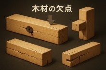 木材は、見た目がきれいでも内部に「欠点(弱点)」があることがあります。 代表的なものは次の3つです。 ①節(ふし):枝が生えていた跡 ②切欠き・割れ:加工や乾燥でできた欠けやひび ③目切れ:年輪の筋が途中で途切れている部分 これらの欠点が、梁(はり)など「大きな力を受ける場所」にあると、木材は弱くなって壊れやすくなります。