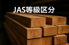 ■目視等級区分とは? 人が木材を目で見て、節や割れ、曲がりなどの欠点をチェックして等級を決める方法です。 ・梁や横架材(横向きで曲げに強さが必要な部分) → 「甲種構造材」 ・柱(縦向きで圧縮に強さが必要な部分) → 「乙種構造材」 さらに梁などの甲種はサイズによって「Ⅰ」と「Ⅱ」に分けられます。 ■機械等級区分とは? 木材のヤング係数(硬さやたわみにくさを示す数値)を機械で測定し、その値で等級をつける方法です。 等級は、E50からE150まで、20刻みでランク付けです。 機械判定だけでなく、節や割れ、腐り具合なども基準があります。 また、木材の乾燥度合い(含水率)も表示されます。 人工乾燥材のみ対象です。 ・仕上材:SD15(15%以下)、SD20(20%以下) ・未仕上材:D15、D20、D25(25%以下) ■JAS規格の品質基準(柱用・乙種構造材の例) 等級は「1級 → 2級 → 3級」と分かれ、星印(★~★★★)で表します。 例えば… ・節の大きさ:1級は径の30%以下、2級は40%以下、3級は70%以下 ・割れ:1級は「ほぼ無し」、2級は「長さの1/6以下」、3級は「長さの1/3以下」 ・腐れ:1級は無し、2級は軽い腐れならOK(10%以下)、3級はもう少し緩い(30%以下) ・曲がり:1級は0.2%以下、2・3級は0.5%以下 要は「1級はほぼ欠点なし」「2級は多少欠点あり」「3級は結構欠点あってもOK」というイメージです。 <まとめ> ・目視等級区分:職人が木を見て判断する ・機械等級区分:機械で測って性能を数値化する 建物に使う木材は、必ずしもJAS規格品でなくてもいいが、重要な部分にはJAS基準に準じた品質管理が望ましいです。 JASの等級区分は「安全で長持ちする建物をつくるための木材のルール」と考えればわかりやすいです。