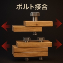 ボルト接合を強く・粘り強くするためには、ボルトの端距離(木材の端からボルトまでの距離)をしっかり取ることが大切です。 ■ボルト接合の2つのタイプ 木材をボルトでつなぐ方法には、次の2種類があります。 ①接合形式A(2面せん断) 3つの部材をボルトでまとめる方法。 たとえば真ん中に木材(主材)があり、それを両側の板(側材)で挟むイメージです。 ②接合形式B(1面せん断) 2つの木材をボルトで直接つなぐ方法です。 Aより構造的に少し弱く、よじれ(偏心)が起きやすい特徴があります。