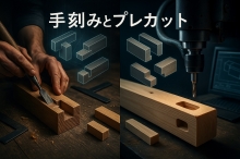 ■「手刻み」と「プレカット」2つの加工方法のちがい ・手加工(手刻み) 大工が木を見極めながら、道具で一つずつ形を作る。 乾燥で縮むことを見越して寸法を微調整できる。 寸法は曲尺(さしがね)の幅=15mmの倍数で決まることが多い(現場での共通ものさしに合わせやすい) ・プレカット(機械加工) 工場の機械がCADデータどおりに自動で加工。現場は組み立てが中心。 木材はよく乾燥させ、断面を直角に製材してから加工するのが前提。 ルーター(回転ドリル)で削るため、角(隅)が丸くなる(アール)形状になりやすい。 標準的な形には強いが、特殊形状は手刻みで補うこともある。 ■部位ごとのイメージ(表) 部位 | 手加工(手刻み) | プレカット 胴差し—柱 | 木目や節を見て、抜けや割れが出にくい向きで加工 | CAD通りの標準形状で精度よく量産 梁—梁 | 現場の誤差に合わせて微調整しやすい | 事前の設計通りにぴったり合う前提 渡り腮(わたりあご) | 密着具合を手仕事で追い込める | 安定した再現性。角はやや丸めになりやすい 継手 | 伝統形状や複雑な形も対応しやすい | 主要な継手は対応、特殊形は追加手刻み ■その他の注意点 手刻み: 乾燥収縮を見越した遊びや締めの調整がしやすい。寸法は15mm刻みが基本になりやすい。 プレカット: 乾燥・直角・規格寸法が前提。ルーター加工ゆえ角がRになる。 ■なぜ「木を読む」が大切か ・木は一本ごとにクセがある(節・割れ・年輪の向き・反りなど) ・重要な場所(柱頭柱脚、梁端、継手周りなど)に欠点が来ないよう、目視と判断が不可欠 ・機械は速くて正確だが、木の個性を見ることはできない。最終チェックは人の役割 ■最近のトレンド 工期短縮・職人不足の影響で、プレカットが主流。 ただし、特殊な納まりや現場の微調整は、今も手刻みの出番。 結論: プレカットの効率+手刻みの目利きを組み合わせるのが実務的。 <まとめ> ・プレカット=速い・均一・設計通り。ただし角がRになりがち、乾燥・直角が前提。 ・手刻み=調整力・対応力・木読みに強い。収縮やクセを踏まえてベストな加工ができる。 いずれにしても、構造上重要部は人の目で確認することが欠かせないです。