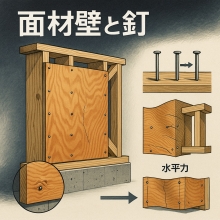 面材壁の強さ(耐力)は、 ・どんな面材を使うか ・どの釘を、どんなピッチ(間隔)で打つか でほとんど決まります。 → 図や仕様書に書いてある、釘の太さ・長さ・間隔、をきちんと守ることが、とても大事です。 ■面材壁とは? 面材壁とは、 ・構造用合板 ・石膏ボード などの板(面材)を、柱・間柱・梁(横架材)に釘で留めた壁 のことです。 面材壁の強さは主に2つで決まります。 ・面材そのものの、かたさ ・面材を留めている、釘の太さ・長さ・間隔
