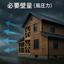 ■風圧力に対する必要壁量とは? 木造住宅は、地震だけでなく台風などの強い風からも建物を守る必要があります。 そのために、 どの階・どの方向に、どれだけの長さの耐力壁が必要か、 を決める指標が 風圧力に対する必要壁量 です。 ・地震:建物の重さに比例して水平力が大きくなる ・風 :建物が風を受ける面積(=受風面積)に比例して水平力が大きくなる 風を受ける面積を整理したものが、見付け面積 です。