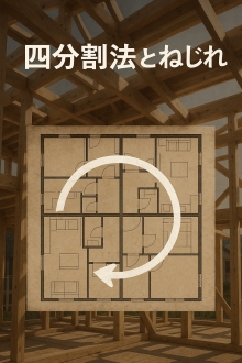 四分割法は、 耐力壁(地震や風に耐える壁)が、建物の平面内でバランスよく配置されているか を簡単にチェックするための方法です。 木造住宅は、鉄筋コンクリート造などに比べて床や架構が柔らかくねじれやすいため、 壁量(どれだけ耐力壁があるか) だけでなく、 どこに壁があるか(配置バランス) も確認する必要があります。 ■ねじれが問題になるケース 建物全体の壁量は足りていても、耐力壁が一部に偏っていると、地震力が加わったときに建物がぐるっと回るようにねじれて、倒壊の危険が高まります。 例: 片側だけ道路に面した狭小住宅 → 道路側は開口が大きく壁が少ない/反対側は壁だらけ 角地の住宅 → 道路側2面はほぼ開口、残り2面は壁が集中 阪神・淡路大震災では、こうした壁配置の偏りによるねじれ倒壊が多くみられました。 この反省から、2000年の建築基準法改正で、従来の「壁量計算」に加えて、耐力壁をバランスよく配置するための規定(旧:平成12年建設省告示第1352号)が導入されました。 ※現在は、2024年の告示改正により、四分割法を定めていた旧・告示第1352号は廃止され、内容は国交省告示第1100号「木造の建築物の軸組の構造方法及び設置の基準を定める件」に統合されています。 ただし、四分割法の考え方・計算手順そのものは、基本的に従来と同じです(2025年11月時点)