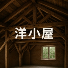 ■洋小屋ってどんな小屋組? 洋小屋は、いくつかの部材を、トラス状に組み合わせてつくる小屋組です。 主な部材はこんな感じです。 ・合掌(がっしょう): 屋根勾配に沿って斜めに立つ部材(左右から棟に向かって立ち上がる材) ・陸梁(ろくばり): 水平に架けられた梁(トラスの下弦材のイメージ) ・真束(しんづか): 棟から陸梁へ、鉛直方向に立てる束 ・方杖、斜材: 束同士を斜めに繋ぐ部材(トラスの対角材の役割) これらで1つのトラスユニットをつくり、それを約2mピッチで並べて、その上に母屋や垂木をのせて屋根面を構成します。
