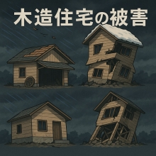 ① 台風による被害 典型的な被害の例: ・強い風で軒先が持ち上げられ、屋根全体が飛ばされる ・屋根材(瓦・スレートなど)が剥がれて落下する ・看板が飛ばされる ・納屋などの小さな建物が、風で転倒する これらの多くは、部材どうしの接合が不十分なことが原因です。 特に、屋根と軒先の取り合い、柱・梁・桁と金物の固定、アンカーボルトの有無・本数などが重要です。 例: 納屋が転倒するケースでは、基礎と建物をつなぐアンカーボルトがなかったり、本数が足りなかったりすることが原因になります。 ② 積雪による被害 主な被害パターン: 想定より多く雪が積もり、梁や柱が荷重に耐えられず、つぶれる・折れる 北側と南側で雪の解け方が違い、片側だけに重い雪が残る → 建物に偏った荷重がかかり、全体が傾く・ねじれる ポイントは、雪荷重の大きさと荷重の偏りです。 設計時に地域の積雪量をきちんと想定し、梁や柱の断面やスパンを適切に決めておかないと、部材が壊れやすくなります。 ③ 地震による被害 地震被害の中で、特に多いのが 、地盤・基礎に原因があるケース です。 地盤・基礎に関する典型的な被害; ・束石だけの簡易な基礎の場合: 束石の上に柱を立てただけのような構造だと、地震時に柱の足元がバラバラに動きやすくなります。 →その結果、建物全体が大きく変形し、倒壊につながることがあります。 ・軟弱地盤+無筋コンクリート基礎: 軟弱な地盤の上に、鉄筋の入っていないコンクリート基礎(無筋基礎)をつくる 地震で地盤が大きく揺れると、基礎が割れたり、ずれたりする → それに引きずられて上部構造(柱・梁・壁など)も大きな被害を受けます。 ・アンカーボルトの不足・不備 基礎と土台をつなぐアンカーボルトが足りない、締め付けが甘い、位置が悪いなどの場合、大きな地震で建物が基礎からズレたり、浮き上がったりして、上部構造に深刻な損傷を与えます。 ・耐震要素や接合不良による被害: 地盤・基礎の問題に次いで多いのが、次の2つです。 〇耐震要素(耐力壁など)の不足・偏り 〇接合部の不良 特に、以下のような建物は危険になりやすいです。 ◆南側の開口部(窓や掃き出し)が大きく、壁が少ない住宅 ◆間口の狭い都市型住宅(狭小間口) ◆角地に建つ建物で、道路側に開口が多く、壁が偏っているもの こうした建物では、耐力壁が一方向や一部に偏っているため、地震時に建物がねじれるように揺れ、最悪の場合は、特定の階がつぶれる層崩壊や、ねじれを伴う倒壊を起こすことがあります。 ・水平構面の水平剛性不足による被害 一見、分かりにくいですが、床や屋根などの水平構面の剛性が不足していることが原因で起こる被害もあります。 例として、細長い平面形をした酒蔵のような建物があります。 ・建物の中間部に壁がほとんどなく、がらんどうになっている →地震時に、中間部の水平構面が大きく変形する →変形に耐えきれず、その部分から崩壊する このように、壁だけでなく、床・屋根の固さ(水平剛性)も耐震設計では重要です。 ・老朽化・劣化による被害 新築時には問題がなくても、時間の経過や劣化によって大きな被害につながるケースもあります。 特に注意が必要なのが、 〇腐朽(木材の腐れ) 〇蟻害(シロアリによる被害) これらは、構造材そのものの強度を低下させますが、 ◆仕上げ材(外壁・内装材)の裏側で進行する ◆見た目からは分かりにくい という厄介な特徴があります。 ●対応の考え方 ・腐朽、蟻害を受けにくい工法・材料を採用する ・竣工後も定期的に点検しやすいような、点検性の高い設計にしておく こうした工夫が、長期的な安全性の確保には重要です。 ■代表的な被害パターン(整理) ●台風による被害パターン ・先の接合不良 → 屋根の吹き上がり・飛散 ・アンカーボルトの不備 → 建物全体の浮き上がり・転倒 ●積雪による被害パターン ・偏った雪荷重 → 梁・柱の破壊、建物の傾斜 ●地震による被害パターン ・無筋基礎が壊れ、それに伴って上部構造も壊れる ・特に軟弱地盤上に多い ・接合不良により、柱や土台が基礎から踏み外してしまう ・狭小間口の建物で、耐力壁が不足し、特定の階がつぶれる(層崩壊) ・水平構面の水平剛性不足により、建物の一部が大きく変形して破壊する このように、木造住宅の被害は、 ・地盤、基礎 ・部材の強さ(断面) ・耐力壁の量と配置 ・接合部の信頼性 ・水平構面の剛性 ・劣化対策 といった基本的なポイントを押さえることで、大きく減らすことができます。