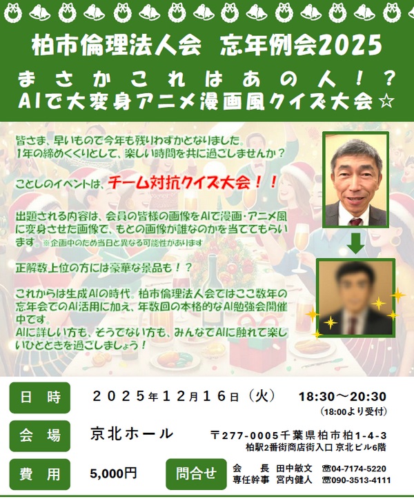 これからは生成AIの時代。柏市倫理法人会ではここ数年の忘年会でのAI活用に加え、年数回の本格的なAI勉強会開催中です。