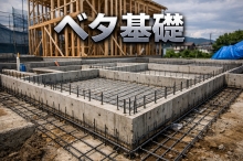 ■ベタ基礎とは? ベタ基礎は、1階床下の全面にコンクリートの底版(スラブ)を敷き、さらに 建物の外周や主要な通りの下に地中梁を連続して入れる基礎形式です。 地耐力が20kN/㎡程度の軟弱地盤でも採用しやすいのが特徴です。 ■不同沈下が心配なときの考え方 地盤が場所によって弱かったり、沈下の不安がある場合は、基礎全体を硬くして変形を抑える必要があります。 そこで、地中梁で区切られた面積(スラブの1区画)を、目安として 20㎡以下になるように地中梁を配置し、基礎の剛性を高めます。