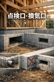 ■まず結論 基礎に「点検口」や「換気口」を開けると、基礎梁(きそばり)を切ることになり、強さが大きく下がります。 そのため、開口はできるだけ避け、どうしても必要なら 梁の連続性(つながり)を保てる位置に慎重に設けます。 また、開口の角はひび割れが入りやすいので、補強筋(鉄筋)でひび割れ対策が必要です。