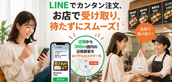 LINE公式アカウントを活用し、店舗から300m圏内の近隣顧客をロイヤルカスタマー化する注文システムです 。お客様はスマホから簡単に事前注文・時間指定ができ、店頭で待たずに受け取れます 。